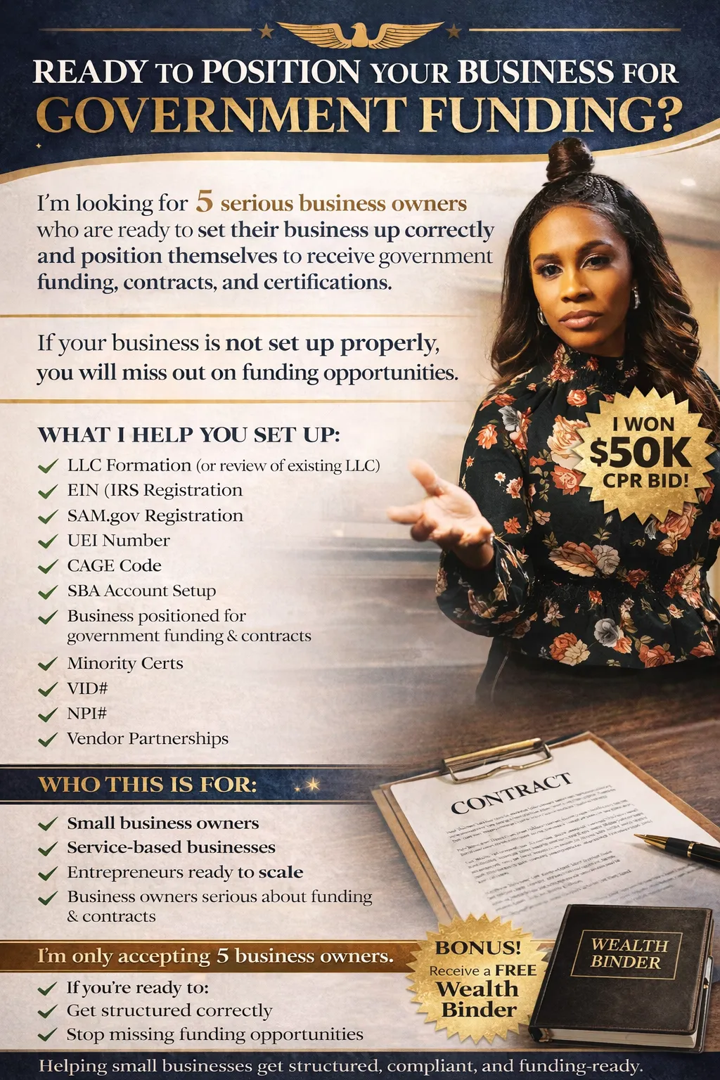 I secured a $50,000 CPR government bid, and I help business owners get positioned correctly so they can pursue government opportunities with confidence.